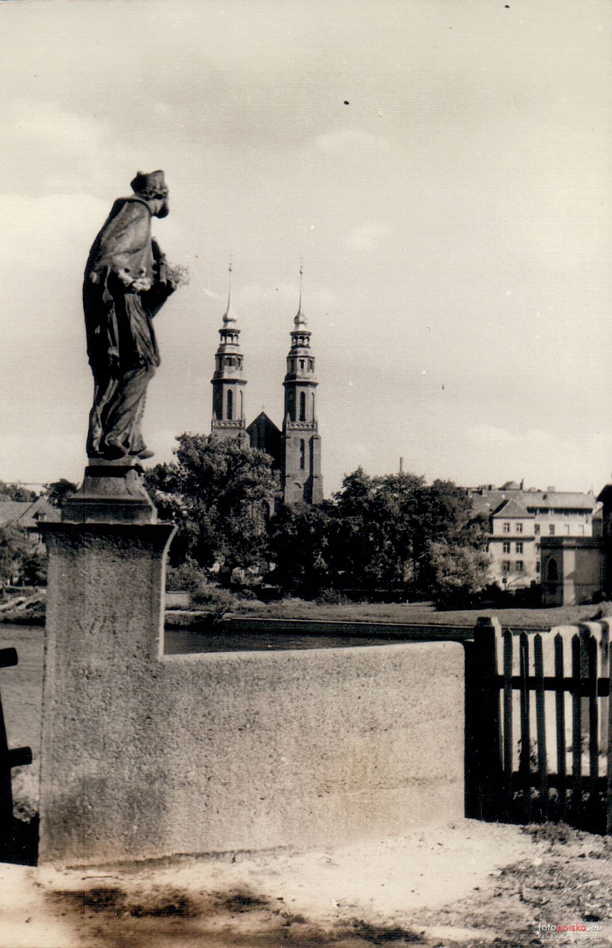 Lata 1950-1957 , Figura św. Jana Nepomucena jeszcze na swoim starym miejscu nad Odrą, przed przeniesieniem jej w pobliże kościoła św. Piotra i Pawła, pomiędzy rokiem 1955 a 1957.Skomentuj zdjęcie