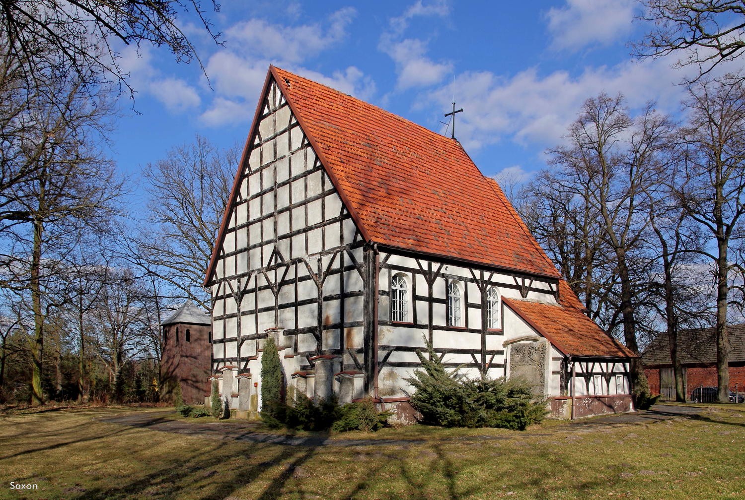 Budowa i wyposażenie. Kościół szachulcowy, jednonawowy konstrukcji słupowo – ramowej. Prezbiterium mniejsze od nawy, pięciobocznie zamknięte z boczną zakrystią. Z boku nawy kruchta z schodami na emporę. Dach dwukalenicowy, kryty dachówką. W fasadzie frontowej wmurowane epitafia. Wewnątrz jednokondygnacyjna empora obejmująca również prezbiterium. Strop belkowy. Ołtarz główny barokowy. Ambona osadzona na skręconym słupie z pelikanem karmiącym młode na baldachimie. Chrzcielnica barokowa. Drewniana dzwonnica. Zbudowana na planie kwadratu, zwieńczona dachem namiotowym.