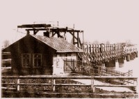 1870 , Toruński most drewniany w ostatniej odsłonie, tj. o konstrukcji kratownicowej z 1863 r. - widok z 1870 r. Po pożarze tej konstrukcji w 1877 r. zaniechano już dalszego odbudowywania i utrzymywania stałej, drewnianej przeprawy w Toruniu.