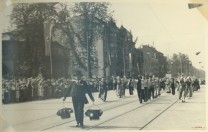 1937 , Pochód w czasie Ogólnoniemieckiego Zjazdu Śpiewaczego. Ulica Powstańców Śląskich między Swobodną i Zaolziańską, widok w kierunku południowym.Skomentuj zdjęcie