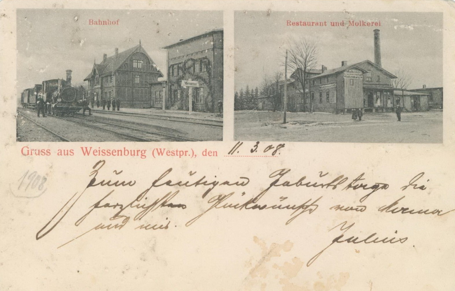 1907 , Stacja kolejowa Rakowice i restauracja. Weissenburg to nazwa nieistniejącego już dziś folwarku. Obecnie stacja podlega pod Rakowice.Skomentuj zdjęcie |