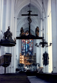 Najcenniejszy element wyposażenia, tryptyk "Sąd Ostateczny" Hansa Memlinga (1467-73), jest przechowywany w Muzeum Narodowym w Gdańsku (w kościele znajduje się jego kopia).
