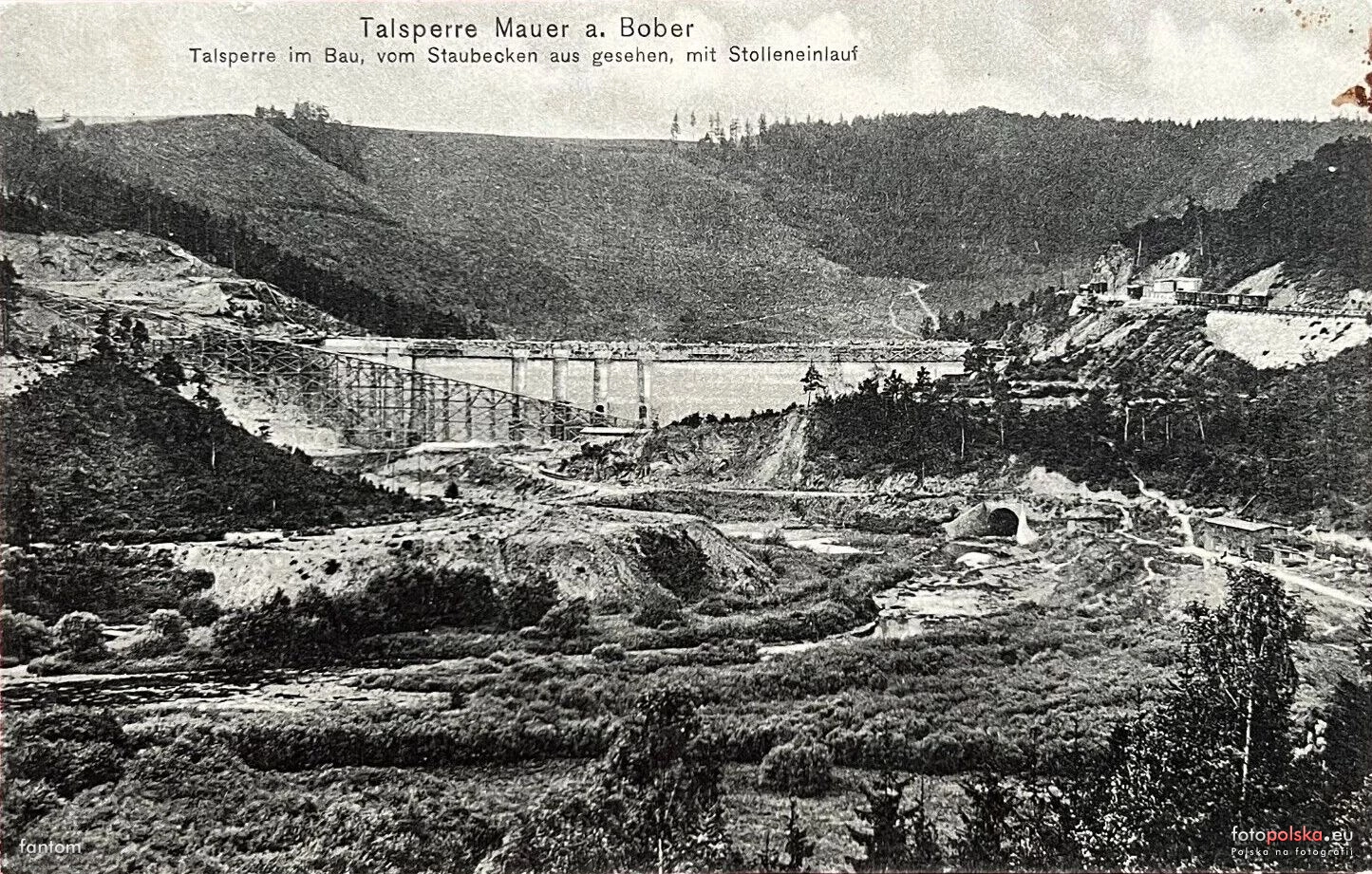 Lata 1907-1909 , Pilchowice. Budowa zapory. Widok od strony stacji PKP na nieistniejące jeszcze Jezioro Pilchowickie. Z prawej strony widoczny boczny kanał odpływowy znajdujący się obecnie na dnie jeziora.Skomentuj zdjęcie
