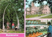 1988 , Mysłakowice: brama ze szczęk wieloryba w parku pałacowym, pałac- obecnie szkoła, zakłady przemysłu lniarskiego "Orzeł". Pocztówka wyd. KAW.Skomentuj zdjęcie
