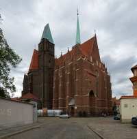 Kościół ma 66 m długości, 44 m szerokości, wysokość naw – 19 m. Dwie wieże, znajdujące się w narożach między halą a transeptem (tylko południowa, wyższa została w pełni ukończona, zakończona iglicą, wysoka na 69 m) są pokryte blachą miedzianą i pochodzą z ok. 1484 r..