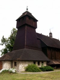 Kościół drewniany, orientowany położony na szczycie wzgórza we wschodniej części wsi, pochodzi z końca XIV wieku. Wokół świątyni znajduje się drewniane ogrodzenie nakryte dwuspadowym gontowym daszkiem. Wokół kościoła zachował się starodrzew m.in. lipy i osiki i pozostałości ziemnych fortyfikacji. Od północy za płotem znajduje się kopiec ziemny wójta Michała Pyrza.