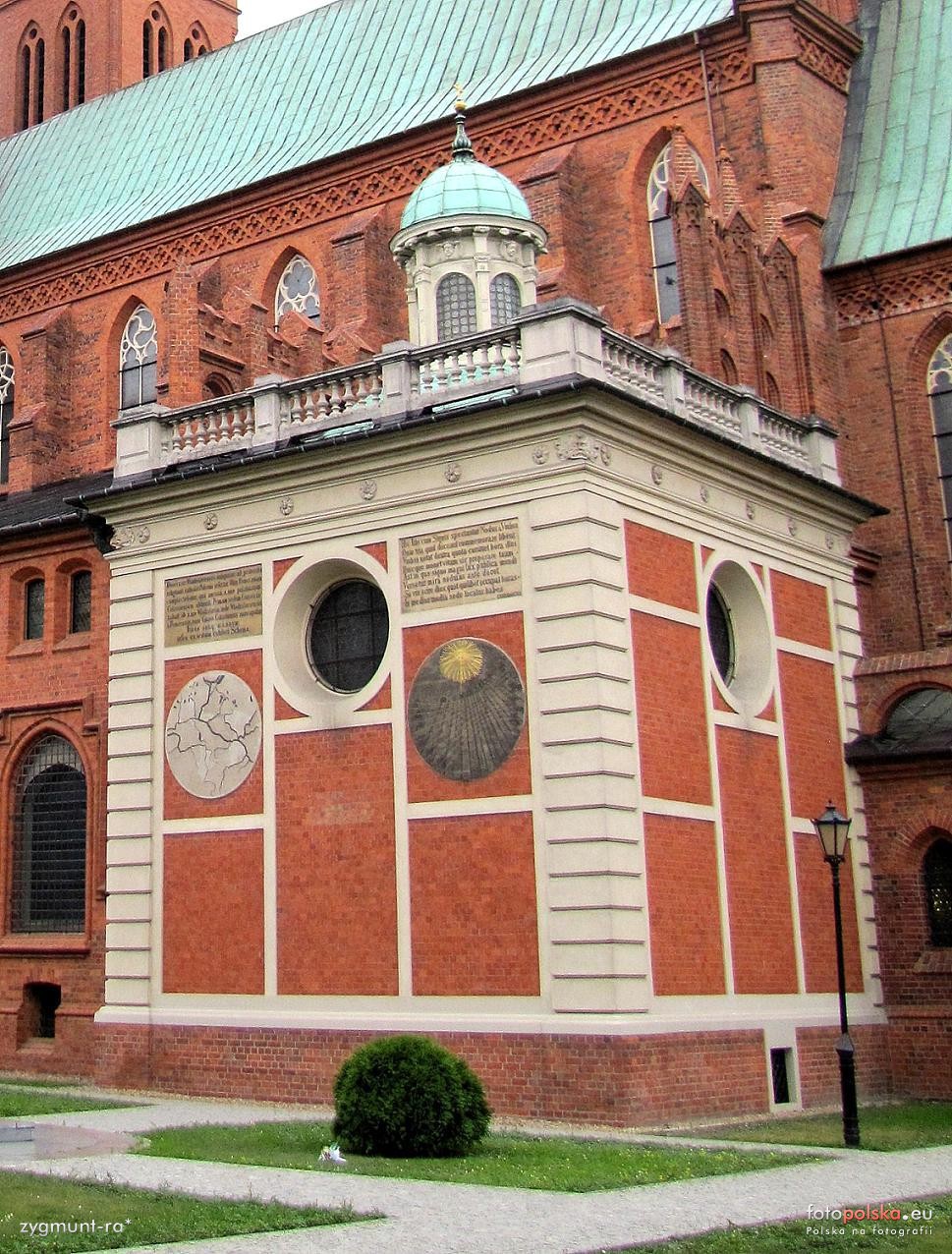 26/ Zegar słoneczny powstał ok.1490 roku wykonany przez matematyka, astronoma i gnomnika Mikołaja Wodkę z Kwidzyna. Zegar ten tradycja włocławska przypisuje Mikołajowi Kopernikowi, którego wuj późniejszy biskup warmiński Łukasz Watzenrode był kanonikiem we Włocławku. Mikołaj Wodka, który studiował w Bolonii, był profesorem we włocławskiej szkole katedralnej, która w XV i XVI wieku skupiła grono wybitnych ludzi epoki, biskupów humanistów, kanoników, kształcąc na poziomie quadrivium. Z tym kręgiem związani byli ludzie tej miary co Kallimach, prymas Maciej Drzewicki posiadacz pierwszego ekslibrisu w Polsce, Mikołaj Kopernik, prymas Stanisław Karnkowski, który założył w 1569 roku we Włocławku pierwsze w Polsce Seminarium Duchowne. W XVII wieku zegar przeniesiono na południową ścianę manierystycznej kaplicy pw. Najświętszej Marii Panny. Zegar jest wykonany w tynku, w formie dekoracji sgraffitowej, posiada gnomon, który wskazuje czas, długość dnia i aktualny znak zodiaku umieszczony na obrzeżu tarczy. Trudno określić w jakim stopniu obecny stan zegara odzwierciedla dzieło astrologa i medyka Abstemiusa [ok. 1442-1494]. Szkoła katedralna powstała w XII wieku, w XV i XVI wieku była filią Uniwersytetu Jagiellońskiego.