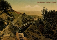 Lata 1905-1910 , Przepust pod torami na wysokości Gołaczowa (niewidocznego na zdjęciu z prawej strony). Pociąg pokonuje wzniesienie torów w kierunku Kulina Kłodzkiego.Skomentuj zdjęcie |