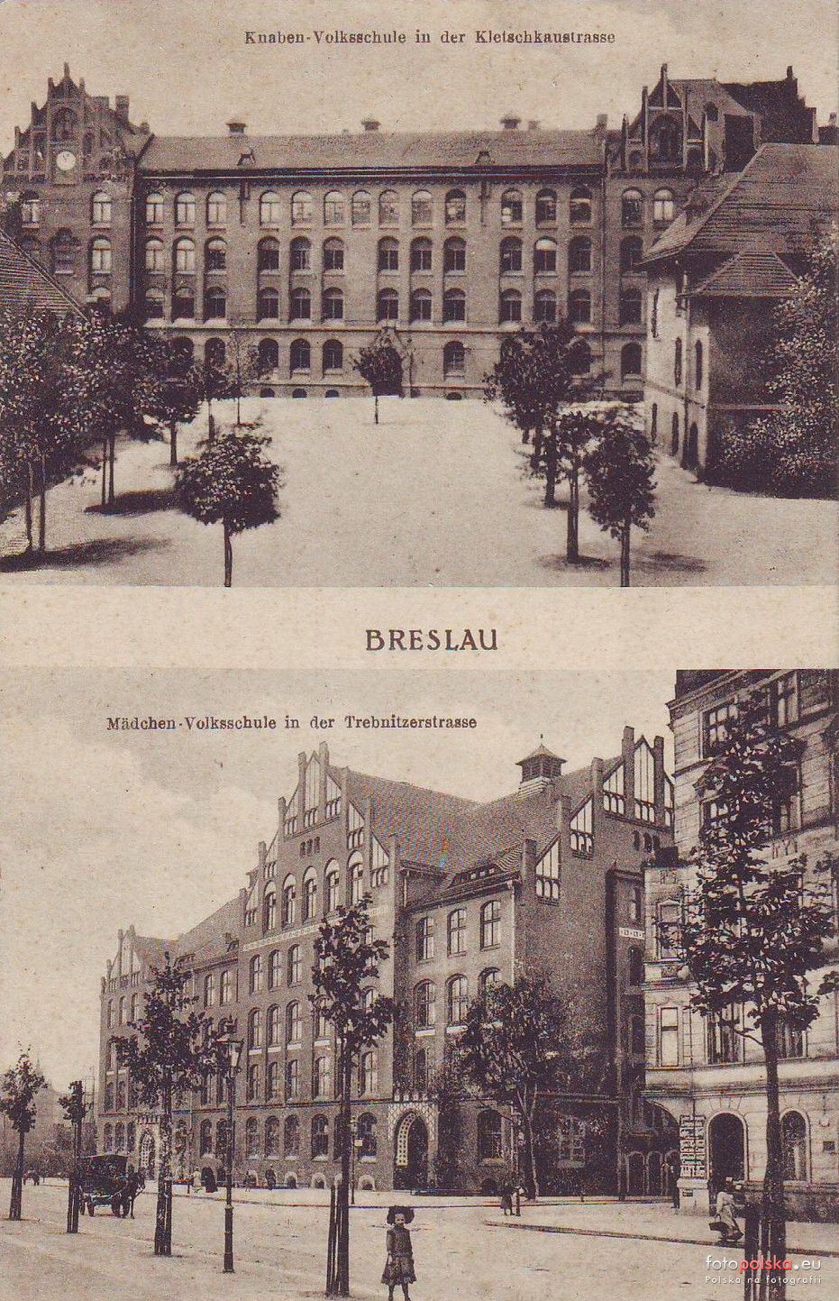 1910 , Dwa budynki szkoły stojące tuż obok siebie - jeden przy ulicy Trzebnickiej a drugi przy Kleczkowskiej.Skomentuj zdjęcie |