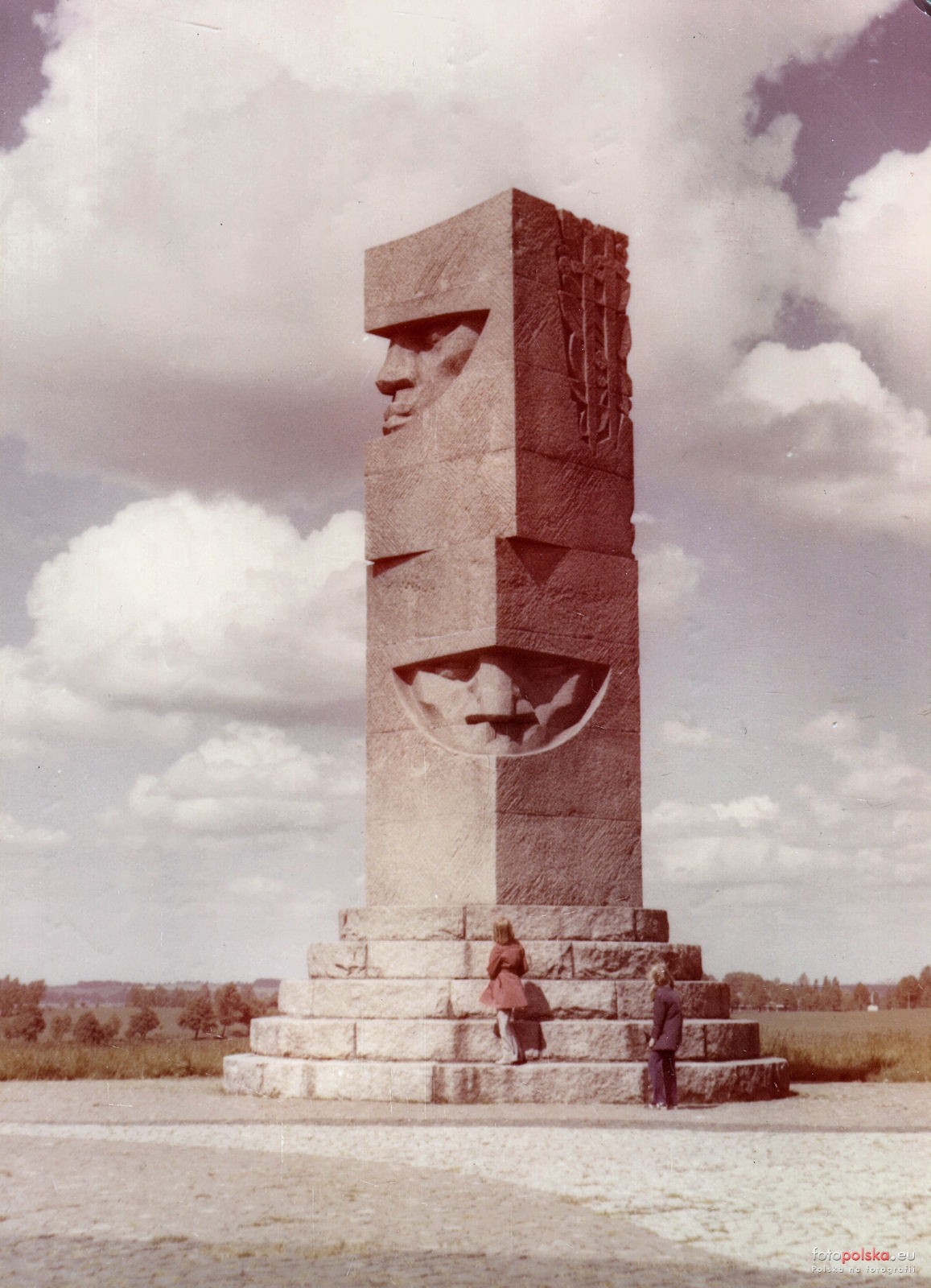 Lata 1976-1978 , Fragment pomnika Zwycięstwa Grunwaldzkiego - granitowy obelisk z rzeźbami głów rycerzy, mieczy grunwaldzkich i Krzyża Grunwaldzkiego.