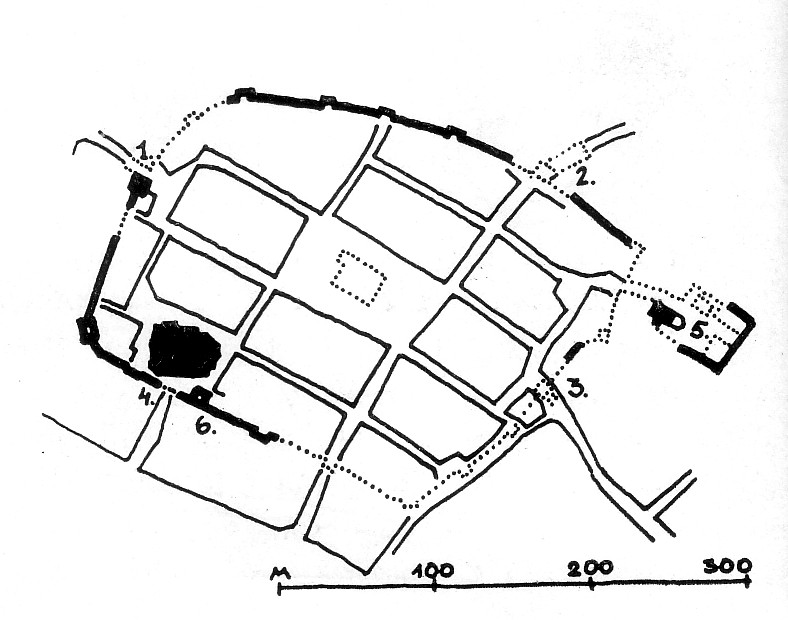 Lata 1960-1965 , Schematyczny plan Lubina z lat 60-tych XX w. z zaznaczonym przebiegiem murów obronnych, bramami - Głogowską (1), Ścinawską (2) i Legnicką -zwaną też Wrocławską (3) i otwartą w XV w. Furtą Kościelną (4) oraz zamkiem (5) i wieżą kościelną (6). Zaczerpnięte z "Mury obronne miast Dolnego Śląska", wyd. Zarząd Okręgu PTTK - Komisja Opieki nad Zabytkami, Wrocław 1966, opracowanie i plany - M. Przyłęcki.Skomentuj zdjęcie |