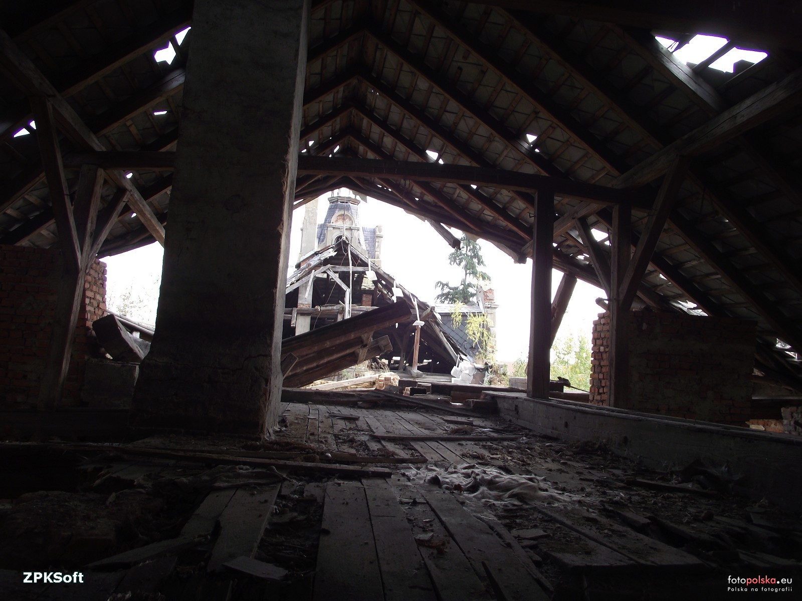 11 października 2014 , Strych zachodniego skrzydła pałacu, oglądamy od spodu resztki dachu. Kwadratowe płytki są z szarego łupka. W głębi widoczne skrzydło wschodnie z wieżą, nad częścią środkową, najstarszą z 1809 r.- dachu nie ma.