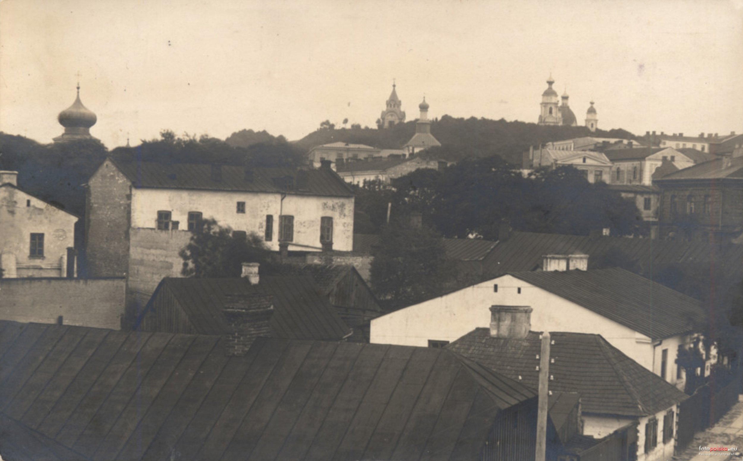 Lata 1914-1918 , Widok ogólny miasta od strony północno-zachodniej, lata 1914-1918. Pierwsza cebula od lewej strony zdjęcia to: Cerkiew św. Jana Teologa, na samej górze zdjęcia: Cerkiew (właściwie cerkiewka) |