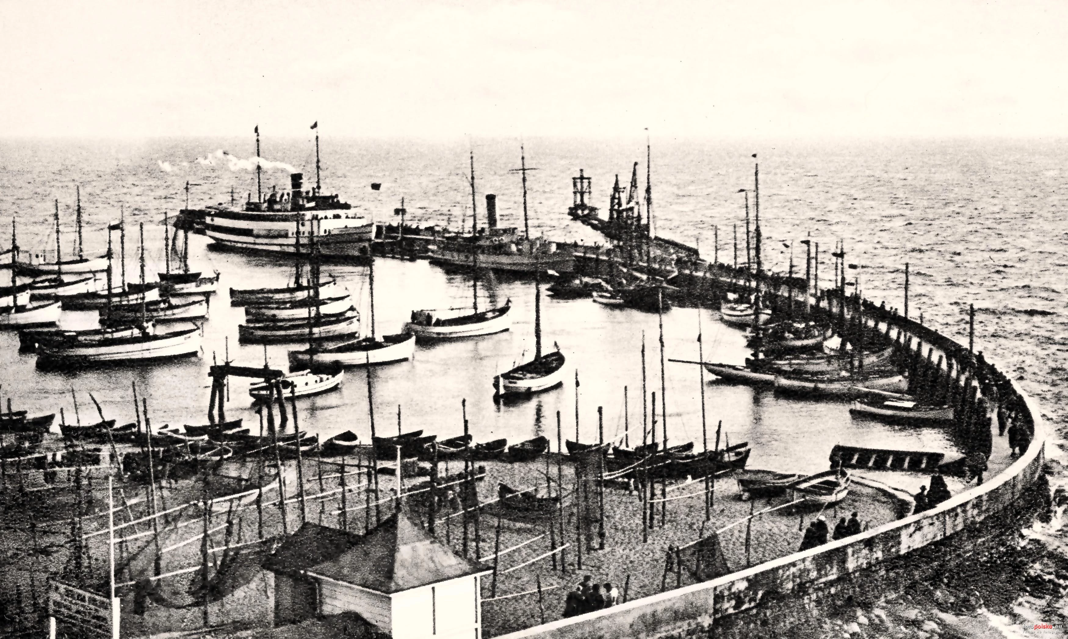 Lata 1930-1933 , Port rybacki i przystań w ujęciu z wieży kościoła św. Piotra i Pawła. Widać prace przy przedłużaniu falochronuSkomentuj zdjęcie