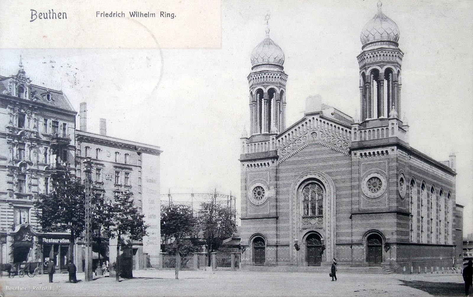 "W tym miejscu stała wybudowana w 1869 roku bytomska synagoga będąca świadectwem wiekowego pokojowego współistnienia wspólnoty żydowskiej w historii miasta. Została zburzona przez niemieckich nazistów w noc kryształową 9/10 listopada 1938 roku." , żródło: