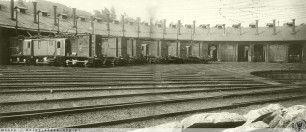 1921 , Brakowało mi przedwojennych zdjęć lokomotywowni, a są przecież takowe. Tutaj, na zdjęciu z lipca 1921 roku ukazano sześć elektrowozów serii EG538-EG549 dostarczanej do Wałbrzycha w latach 1919-1922 (późniejszej E91.3). Lokomotywy były zwane Möbelwagen (wozy meblowe) z uwagi na specyficzny kształt pudła: (trzy segmenty, specyficzna aerodynamika, obudowanie pudła drewnem). Pomimo tego, że zdjęcie jest wykonane po wojnie na pierwszej z lokomotyw (EG545, późniejsza E91 45, złomowana w 1937 roku) widać jeszcze emblematy zarządu pruskich kolei KPEV. Warto zwrócić uwagę na koncentryczną sieć przewodów trakcyjnych nad wachlarzem lokomotywowni. Dziś pozostały po tej konstrukcji kikuty masztów przy budynku. Zdjęcie z archiwum Siemensa, zamieszczone w Eisenbahn-Journal Special, Preussen-Report Bd. 10 - Elektrolokomotiven u. Elektrotriebwagen 1997Skomentuj zdjęcie