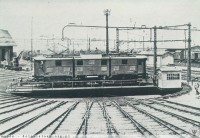 Lata 1927-1936 , Lokomotywa serii E91.8-9 (do obsługi ciężkich składów towarowych, najczęściej spotykana na magistralach węglowych wychodzących z zagłębia wałbrzyskiego) na obrotnicy lokomotywowni Bw Dittersbach. Dobrze widoczne bramy, na których rozwieszone były przewody zasilające specyficzny układ koncentryczny przewodów nad wjazdami na poszczególne w -szopie-. Zdjęcie z lat 30-tych. Zauważalne na lokomotywie są oznaczenia taboru charakterystyczne dla Deutsche Reichsbahn co pozwala na doprecyzowanie datowania. Źródło zdjęcia: S. Bufe -Ostdeutsche Eisenbahnerrinerungen- Egglham 1993Skomentuj zdjęcie
