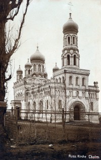 1916 , Cerkiew garnizonowa 65 Moskiewskiego Pułku Piechoty od strony zachodniej, ok. 1916 r., na awersie napis: Russ. Kirche Cholm.Skomentuj zdjęcie |