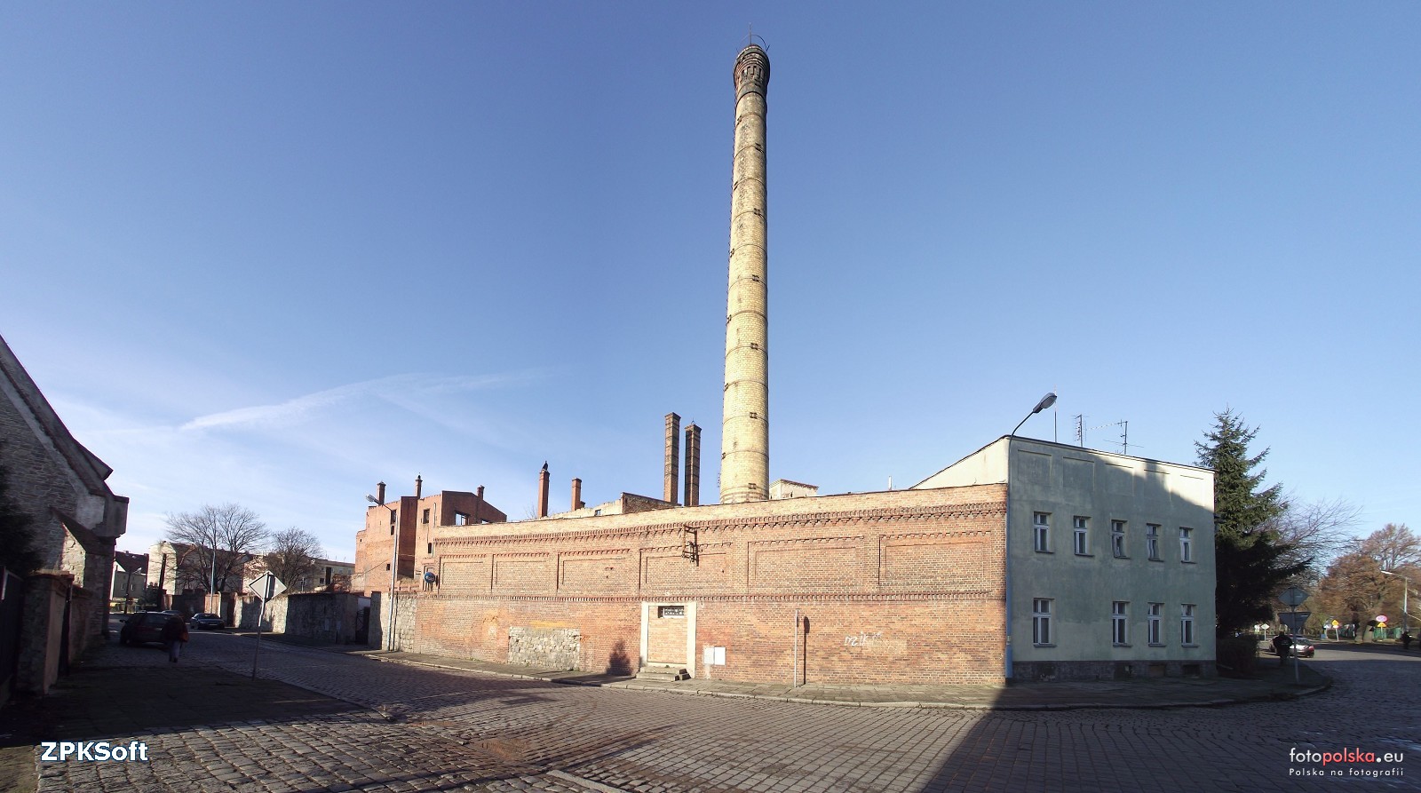17 grudnia 2014 , Spojrzenie na nieczynny browar od strony wschodniej. Komin wygląda na pozostałość po browarnianej kotłowni. Ciekawy ceglany mur z zamurowanym wejściem właśnie do owej kotłowni, gdzie obecnie jest lokal gastronomiczny.Skomentuj zdjęcie