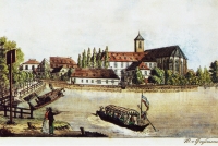 Lata 1830-1840 , Wyspa Piasek widziana z lewego brzegu Odry a po lewej stronie pradziadek mostu Piaskowego?Skomentuj zdjęcie