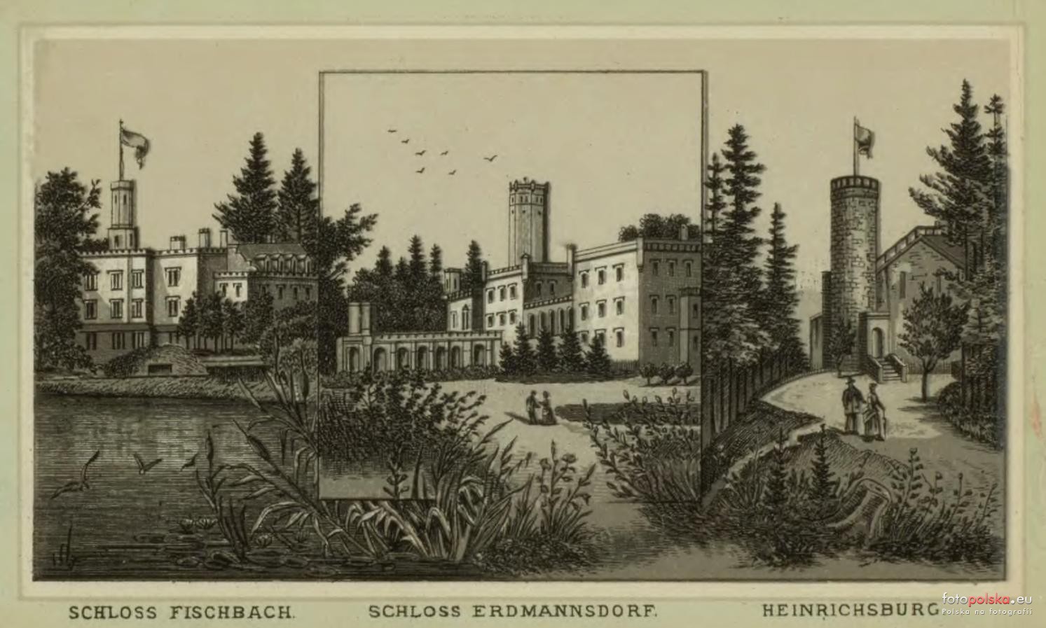 Lata 1875-1890 , Pałac w Mysłakowicach, po bokach pałac w Karpnikach i zamek myśliwski księcia Henryka na Grodnej.Skomentuj zdjęcie |