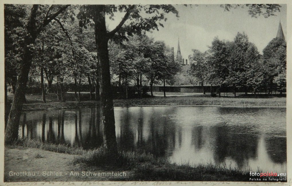 1940 , Widok w stronę centrum miasta od stawu hodowlanego ( dawniej Schwemmteich) przy Potoku Lubeckim w okolicy ul. Szpitalnej. Na wprost: ratusz i kominy palarni kawy a po prawej wieża kościoła ewangelickiego. |