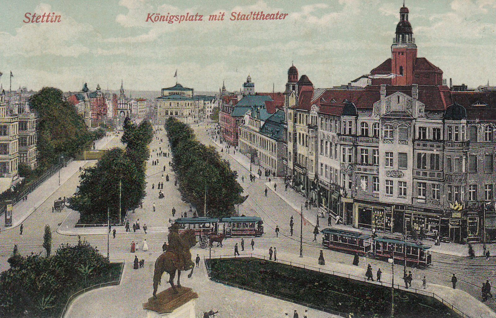 14 pobrań 1510 odsłon 5.86 średnia ocen Poprzednie i następne zdjęcia mar Obiekty widoczne na zdjęciu pl. Żołnierza Polskiego więcej zdjęć (730) Dawniej: Königsplatz, Plac Teatralny Plac Żołnierza Polskiego (niem. Königsplatz) - jeden z głównych placów Szczecina, znajdujący się na północnej granicy Starego Miasta. Plac posiada kształt wydłużonego prostokąta, do niego dochodzą Aleja Jana Pawła II (dawna al. Jedności Narodowej), Aleja Wyzwolenia i Aleja Niepodległości, ul. Tkacka, ul. Staromłyńska, Trasa Zamkowa oraz ul. Matejki (Plac Hołdu Pruskiego). Plac powstawał w 1725 roku. Zabudowa placu składała się wtedy z wielu reprezentacyjnych budowli ówczesnego Szczecina. Pod numerem 13 mieścił się Teatr Miejski, odbywał też się tu liczne pracy i inne uroczystości związane z życiem miasta, zwano go też - Białym Placem Parad (niem. Weiβe Parade Platz). Do 1945 r. na placu znajdował się pomnik dłuta Karla Hilgera ukazujący cesarza niemieckiego Wilhelma I na koniu odsłoniety 1 listopada 1894 r. Encyklopedia Szczecina |