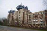 8 kwietnia 2005 , Kompleks mieszkalny przy ul. Wojska Polskiego. Budynki powstały na bazie dwóch, wysokich betonowych konstrukcji nieznanego przeznaczenia. Zdjęcie przedstawia uchwycone dwie niebieskie nadbudówki gdyż jedna nich spłonęła i została zlikwidowana.Skomentuj zdjęcie