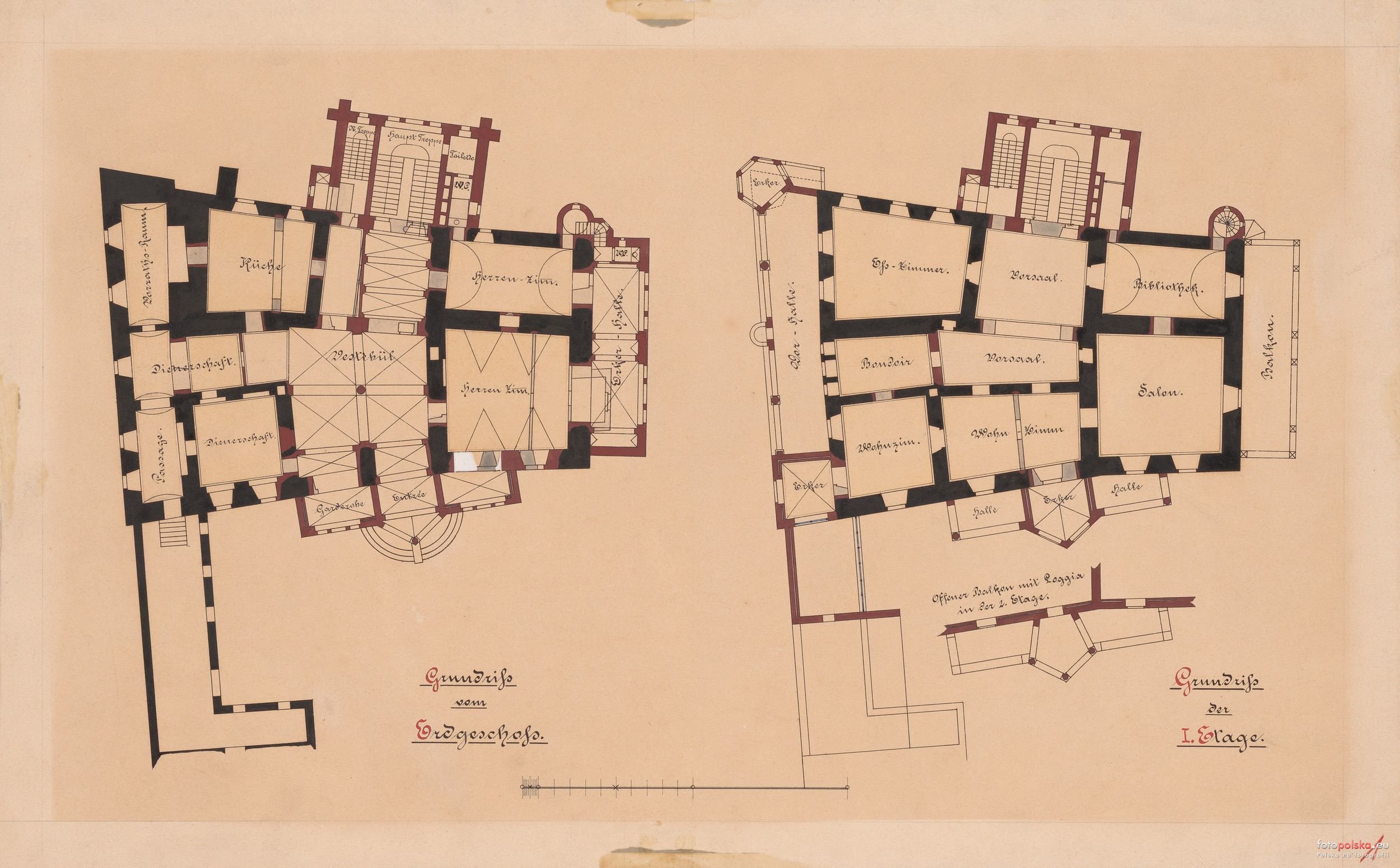 1894 , Pałac w Bobrowie - rzuty parteru i 1 piętra. Arch. Paul Roetger.Skomentuj zdjęcie |