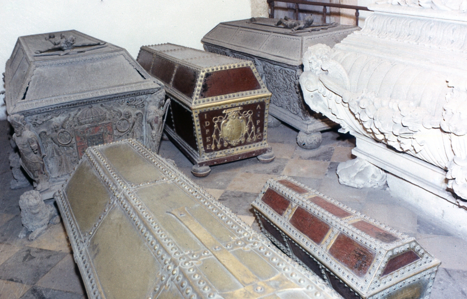 Lata 1980-1986 , Krypta z trumnami Wazów. Z lewej strony, u góry ,sarkofag Zygmunta III Wazy, po prawej biały sarkofag Jana II Kazimierza. - slajd KAW