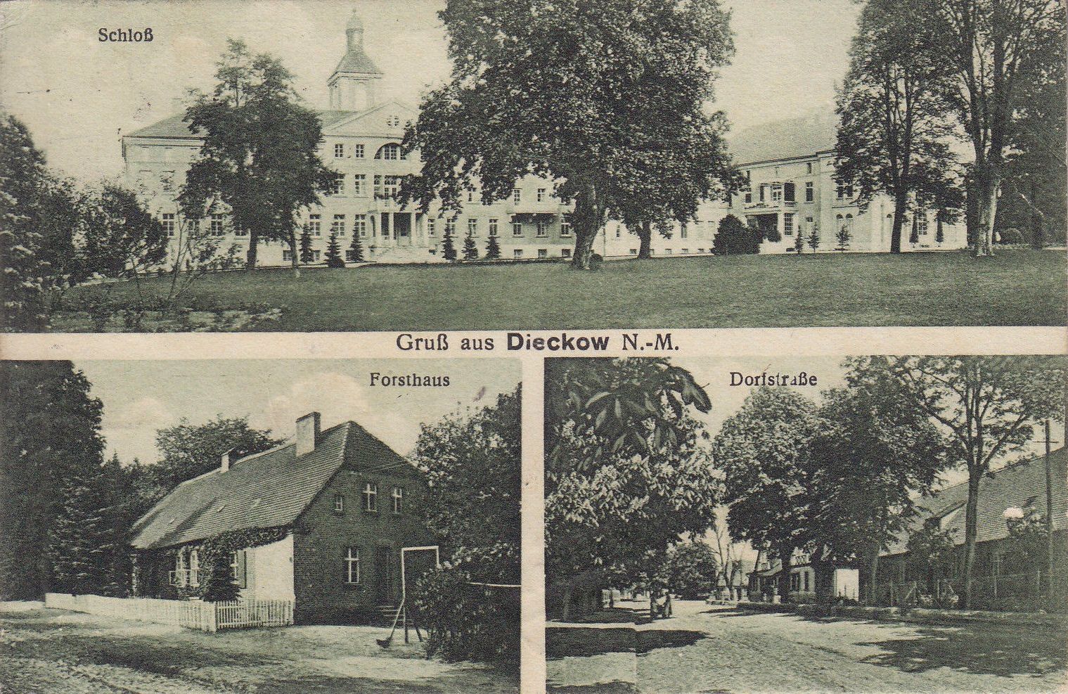 Dzikowo - pałac, leśniczówka, wiejska droga.