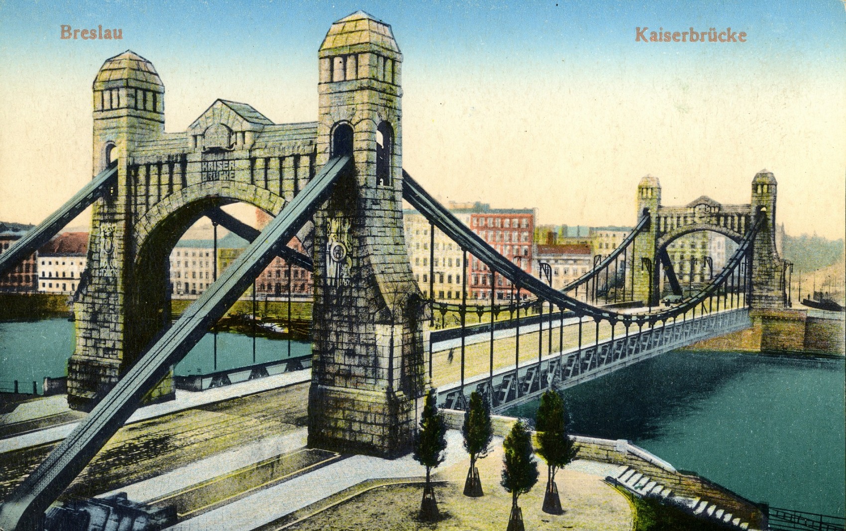 Most Grunwaldzki więcej zdjęć (645) Atrakcja turystyczna Zbudowano: 1908-1910 Dawniej: Kaiser Brücke, Freiheit Brücke Zabytek: A/1653/326/Wm Strona o Moście Grunwaldzkim Most Grunwaldzki we Wrocławiu – most wiszący przez rzekę Odrę o konstrukcji stalowej, elementy nośne wsparte są na pylonach murowanych z cegły i oblicowanych granitem, o wysokości około 20 m. Zbudowany w latach 1908-1910 most powstał w ramach budowy nowej trasy (obecnego pl. Grunwaldzkiego) stanowiącej diagonalne połączenie między centrum miasta a projektowanymi osiedlami na północnym wschodzie. Początkowo nazywany był mostem Cesarskim (Kaiserbrücke), później mostem Wolności (Freiheitsbrücke). Projektantem architektury mostu był miejski radca budowlany Richard Plüddemann, wykonawcą firma Beuchelt u. Co. z Zielonej Góry. Most otwarto 10 października 1910 w obecności cesarza Wilhelma II. Przez most przebiega droga krajowa nr 8 i linie tramwajowe, używające wbudowanego w jezdnię torowiska. Przy okazji ostatniego remontu mostu (2005) poszerzono nieco jezdnie zwężając przy tym chodniki. Wikipedia al. Słowackiego Juliusza więcej zdjęć (983) Dawniej: Am Ohlau Ufer |