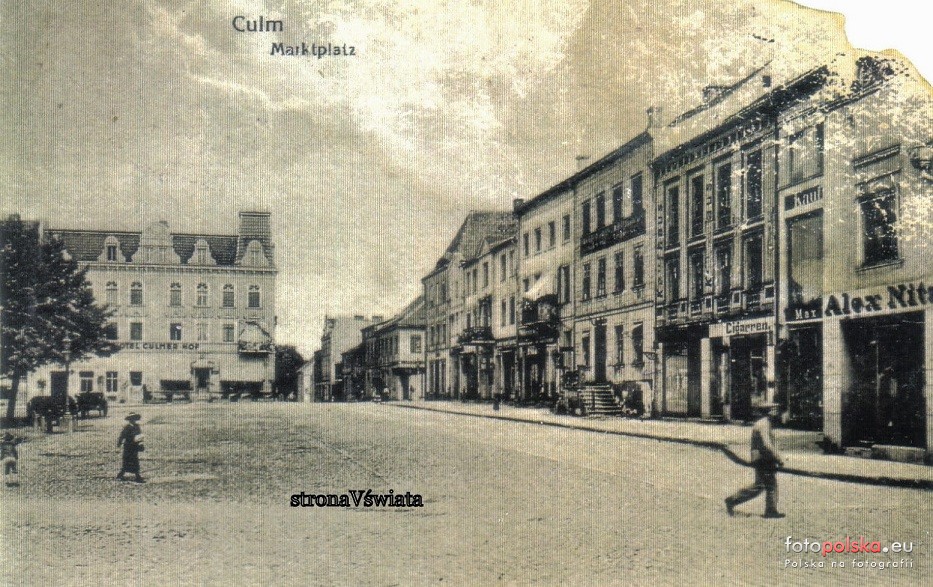 Lata 1910-1915 , Północno - wschodnia pierzeja Rynku w Chełmnie; ...z lewej strony widoczny "Dwór Chełmiński";Skomentuj zdjęcie |