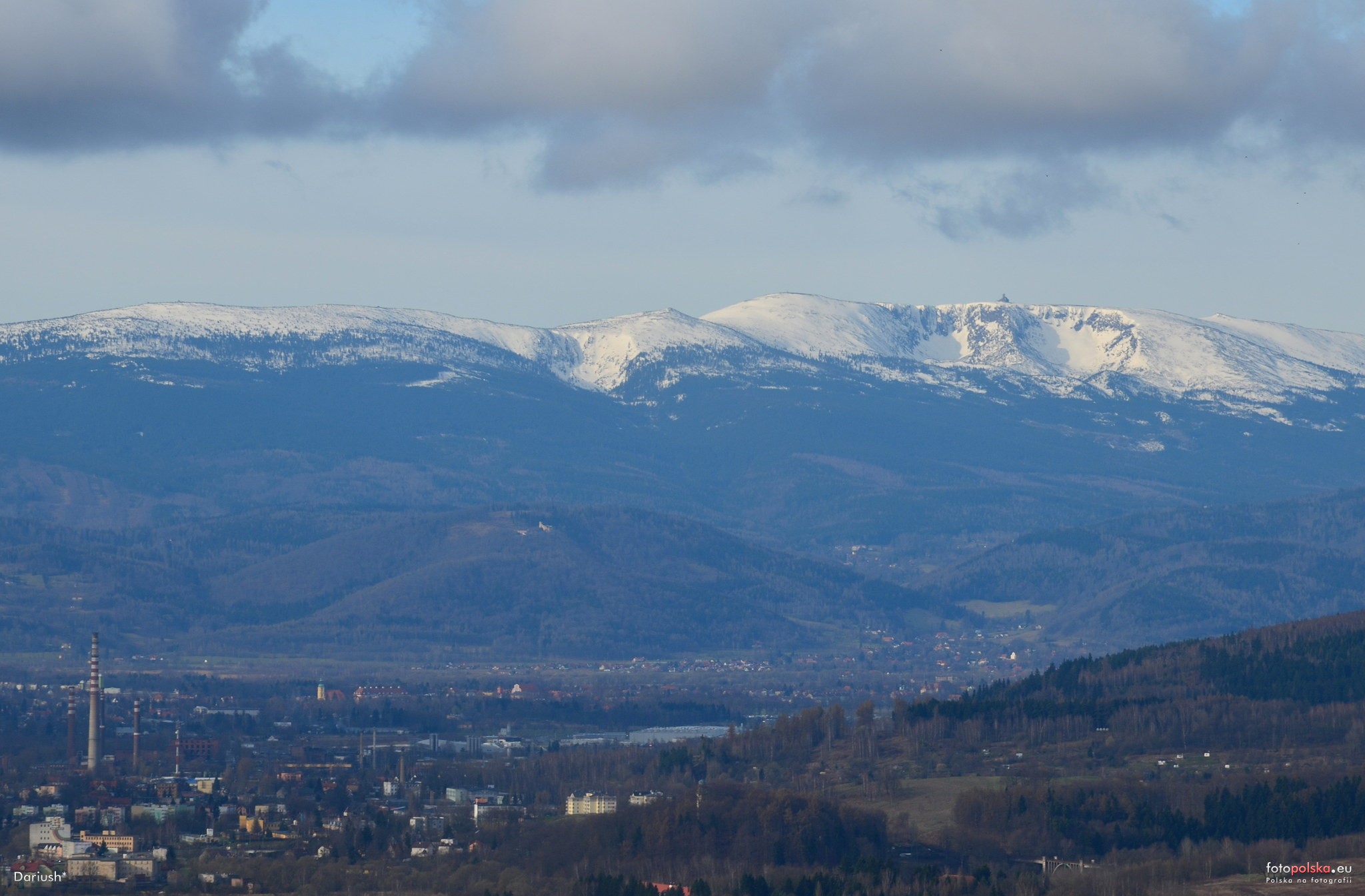 12 kwietnia 2015 , Panorama Śnieżnych Kotłów, fragment Jeleniej Góry i Cieplic (Kościół Ewangelicki i Pałac Schaffogotschów) , Chojnik powyżej.Skomentuj zdjęcie |
