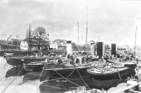 1900 , Okręty na rzece Elbląg zwodowane w stoczni Schichau. Drugi od prawej to torpedowiec morski S.91 zbudowany dla Kaiserliche Marine między 1898 a 1901 r., służył na wodach chińskich. Adnotacja pod spodem (2.4.00) to być może data wodowania, położenia stępki lub wykonania zdjęcia.
