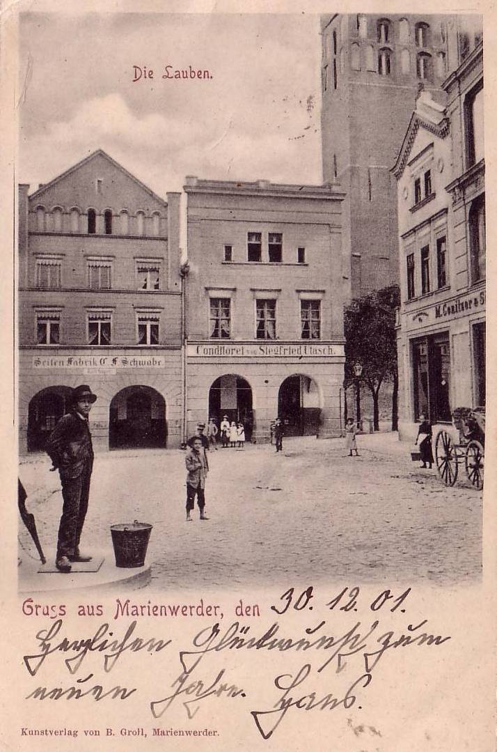 1901 , Narożnik Rynku z podcieniami i wieżą katedralną w tle.Skomentuj zdjęcie |