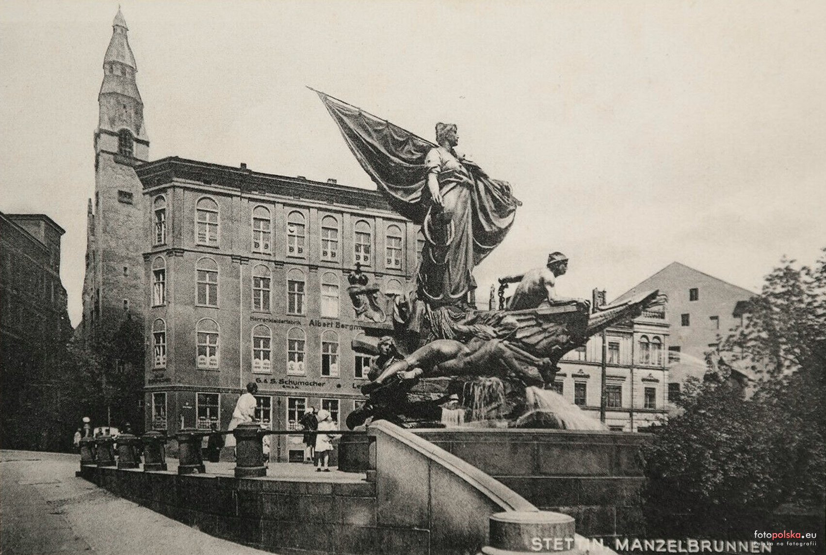 Ufundowaną przez Zarząd Pruskiego Funduszu Sztuki i Zarząd Miasta Szczecina fontannę odsłonięto 23 września 1898 w obecności cesarza Wilhelma II (w połączeniu z uroczystością oddania do użytku Basenu Wschodniego w porcie wolnocłowym na Łasztowni) w północnym narożniku obecnego placu Tobruckiego (wówczas Marktplatz), u zbiegu współczesnych ulic Dworcowej i Nowej. Całość obiektu nazwano Manzelbrunnen (pol. „fontanna Manzla”) od nazwiska autora kompozycji figuralnej – prof. Ludwiga Manzla. Rzeźba została zdemontowana 29 lipca 1942 roku podczas II wojny światowej, po czym została przetopiona na cele wojenne. Oryginał kompozycji figuralnej, stanowiącej główny element fontanny, nie zachował się. W jej miejsce ustawiono kotwicę. W 2004 zawiązał się społeczny komitet mający na celu restaurację fontanny poprzez zrekonstruowanie kompozycji figuralnej z dobrowolnych składek. W 2008 na zlecenie stowarzyszenia „Kupcy dla Szczecina” w Centrum Rzeźby Polskiej w Orońsku powstał ponad dwumetrowy model rzeźby, prezentowany podczas dorocznych Dni Morza.