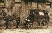 Lata 1909-1915 , Wóz na śmieci przy północnej ścianie budynku zajezdni masztalerskiej (stajni). Od 1906 roku wywóz śmieci odbywał się w specjalnych konnych wozach z kontenerami zwanych Kippwagen. Mieszkańcy w określonych dniach tygodnia wysypywali śmieci do podstawionych wozów. Odjeżdżały one potem do zajezdni, gdzie kontenery przeładowywano na specjalny konny wagon tramwajowy, którym po tymczasowych torach wywożono je na wysypisko. Odpady z zajezdni z ul. Gdańskiej służyły do niwelacji terenu przy Odrze (w miejscu dzisiejszych ogródków działkowych), a w późniejszym okresie trafiały na wysypisko koło ul. Pasterskiej. Widok wagonu: (zdjęcie: archiwum WPO ALBA)Skomentuj zdjęcie
