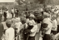 Lata 1971-1978 , Oczekiwanie na przyjazd przemyskiego biskupa na jedną z uroczystości kościelnych. Fotografia wykonana w latach 70. w okolicy kościoła. W tle widoczny dom nr 413 z zabudowaniami gospodarczymi.Skomentuj zdjęcie |
