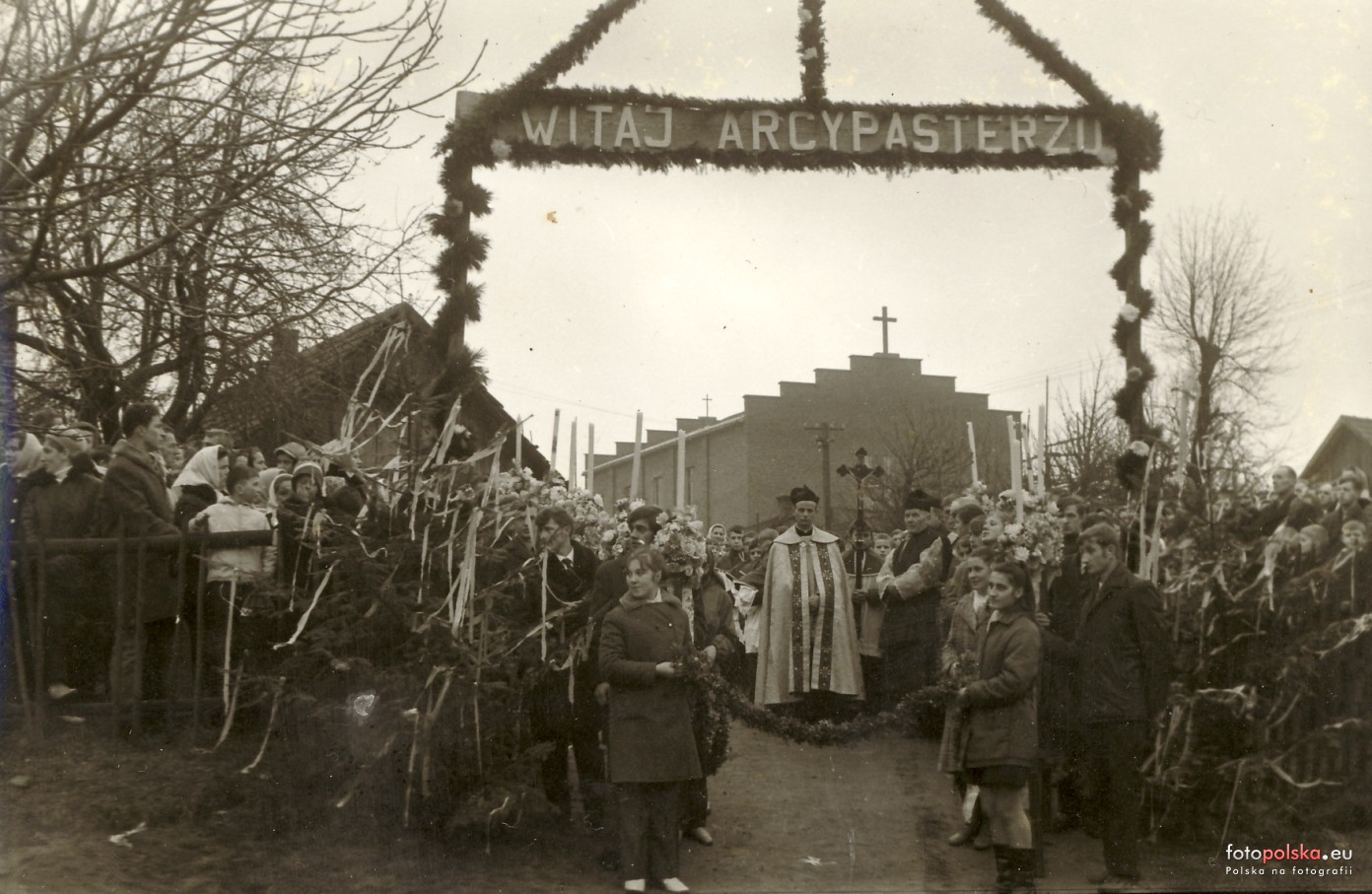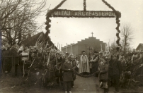 Lata 1971-1976 , Oczekiwanie na przyjazd abp. Ignacego Tokarczuka na jedną z uroczystości kościelnych w nowopowstałej parafii Brzóza Stadnicka. W bramie pierwszy proboszcz parafii, ks. Teodor Marut.Skomentuj zdjęcie |