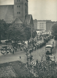 Lata 1960-1965 , Kondukt pogrzebowy zmarłego strażaka przemierza Plac Zwycięstwa przed Kościołem Garnizonowym pod wezwaniem Najświętszego Serca Pana Jezusa.Skomentuj zdjęcie