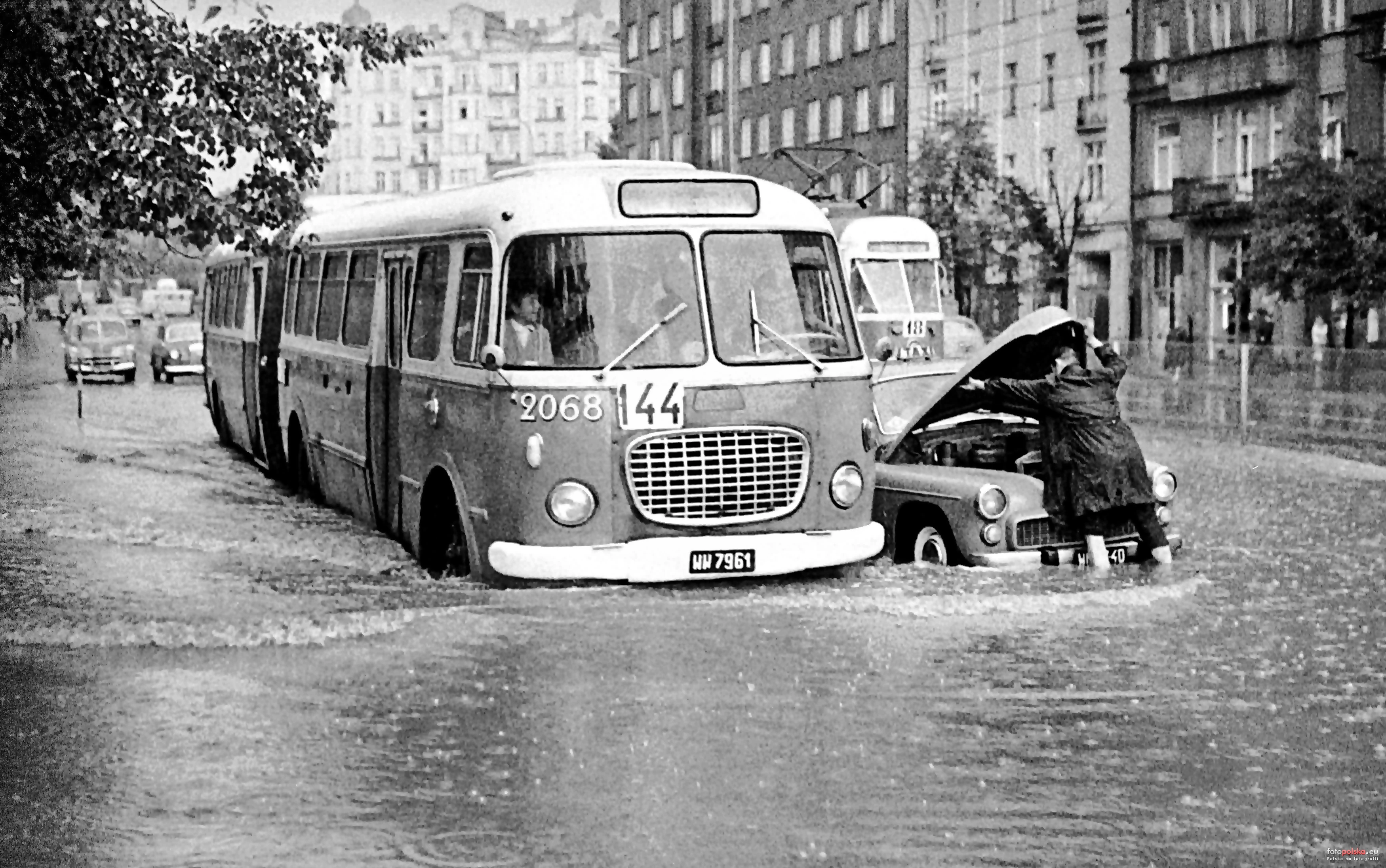 lipiec 1968 , Oberwanie chmury na Puławskiej w lipcu 1968 r. Przegubowy jelcz ogórek na trasie linii 144, która kursowała na Mokotów przez 38 lat.Skomentuj zdjęcie