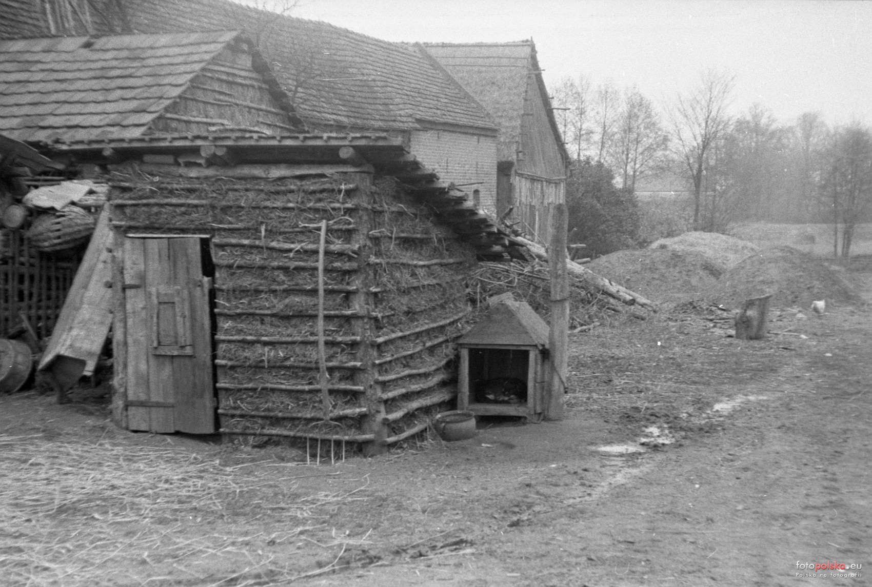 1957 , Drewniana szopa o ścianach z żerdzi poziomych uszczelnionych chrustem i słomą. Dach jednospadowySkomentuj zdjęcie