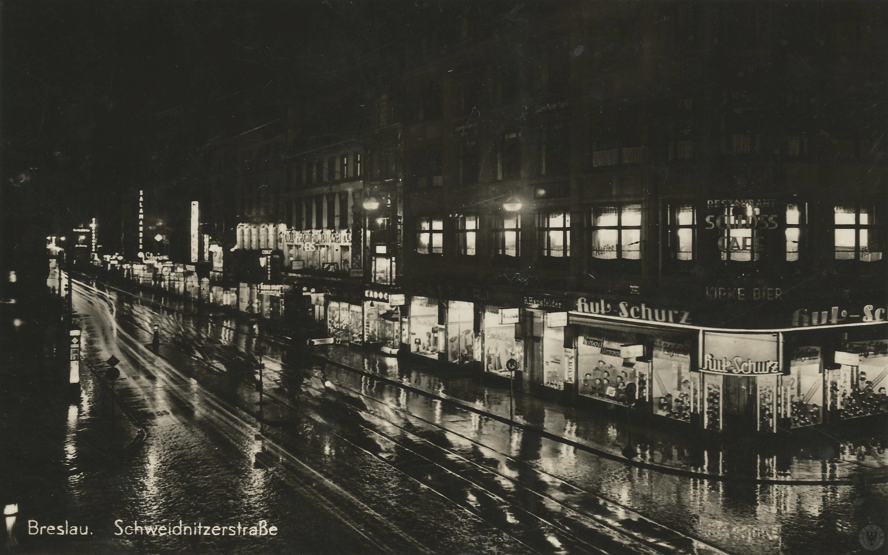 Lata 1925-1940 , Schweidnitzerstr. w nocnej odsłonie. Widok z gmachu Opery w stronę Rynku.Skomentuj zdjęcie