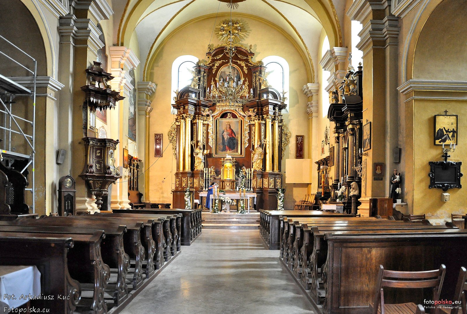 4 pobrania 1137 odsłon 6 średnia ocen Poprzednie i następne zdjęcia Arkadiusz K. (Arro) Obiekty widoczne na zdjęciu Wnętrza więcej zdjęć (8) Kościół Nawiedzenia NMP więcej zdjęć (30) Atrakcja turystyczna Zbudowano: 1539 Zabytek: A-178 z 14.11.1989 Obecny kościół parafialny - najstarsza świątynia na terenie Bieszczadów - został wymurowany z kamienia, na planie krzyża, z dwoma kaplicami tworzącymi jego ramiona i wieżą od pn.-zach., w stylu póżnogotyckim, około 1539 r. Fundatorem był Piotr Kmita, marszałek wielki koronny, kasztelan sandomierski, wojewoda sandomierski i krakowski, właściciel miasta Leska. Uroczystośc poświęcenia nowego kościoła odbyła się w pierwszą niedzielę po Wszystkich Świętych w 1539r. Początkowo kościół parafialny w Lesku był pod wezwaniem św. Mikołaja, a od XVII w. pod wezwaniem Nawiedzenia Najświętszej Maryi Panny. Z XVI wieku zachowały się m. in.: * kondygnacje na zewnątrz wieży po dach; * wykuta w kamieniu nad wejściem od zewnątrz tarcza z herbem Śreniawa Kmitów; * sklepienia póżnogotyckie w kaplicach; * renesansowe portale kamienne - przy wejściu do zakrystii oraz w murze otaczajęcym kościół od północnego zachodu; * okna zamknięte półkoliście z gzymsem podokiennym. Z pierwszej połowy XVIII wieku pochodzi: - chór (przebudowany w latach 1899-1900); - chrzcielnica - barokowa z czarnego marmuru, w kształcie kielicha, puklowana z drewnianą pokrywą; - ambona (1754r.) póżnobarokowa z ornamentami i rzeżbami rokokowymi, wykonana z drewna. Cztery większe rzeżby zdobiące ambonę, to święci: Ambroży, Grzegorz Wielki, Hieronim i Augustyn. Zaplecek z tablicami przykazań jest ujęty kotarą podtrzymywaną przez aniołki. Dwukondygnacyjny baldachim zwieńczony rzeżbami Boga Ojca, aniołków i postaci w zbrojach antycznych oraz Ducha Świętego w postaci gołębicy w glorii. Z II połowy XIX w. pochodzi rzeźba Matki Bożej z Dzieciątkiem na kolumnie (obok ołtarza bocznego w nawie głownej) wykonana z białego marmuru przez Włocha F. Bertiniego. 23 sierpnia 1704r. Szwedzi podpalili Lesko. Wówczas na kościele spłonął dach kryty gontem. Przedtem kościół został ograbiony. Około połowy XVIII wieku Gotfryd Hoffman, architekt śląski przebudował wnętrze (w stylu późnobarokowym) i nieco podniósł jej mury. W 1760r. biskup przemyski Wacław Hieronim Sierakowski dokonał powtórnej konsekracji kościoła. W 1889 roku nadbudowano wieżę kościelną która przybrała wygląd neoromański. Dach został pokryty blachą. Ołtarz główny (z 1770 roku) późnobarokowy z ornamentami i rzeźbami rokokowymi z czterema kolumnami i dwiema pólkolumnami na cokołach, z rzeźbami świętych męczenników biskupów Stanisława i Wojciecha oraz aniołów w zwieńczeniu. W polu głównym znajduje się obraz Grupa Pasji (widoczny w czasie Wielkiego Postu). W pozostałych okresach roku liturgicznego odsłaniany jest obraz Matki Bożej Różańcowej (z II połowy XX w.). W zwieńczeniu ołtarza znajduje się obraz Nawiedzenia Najświętszej Maryi Panny (z I połowy XIX w.) Ołtarz św. Antoniego Pustelnika (w kaplicy południowo-zachodniej) ufundowany w połowie XIX w.; klasycystyczny, z czterema kolumnmi (odnowiony w 2004r.). W polu głównym znajduje się obaz św. Antoniego Pustelnika, pod ołtarzem, antependium w kształcie groty z rzeźbami: leżącej postaci świętego Antoniego i dwóch lwów. Na ścianie wschodniej obraz świętych pustelników Antoniego i Pawła z Teb. Na ścianie zachodniej portret o. Józefa Gracjana Piotrowskiego, pijara znanego w literaturze polskiej satyryka i publicysty, proboszcza leskiej parafii latach 1783-1785 (jego doczesne szczątki spoczywają w podziemiach kościoła). W podziemiach kaplicy spoczywają rotmistrz Franciszek Pułaski, stryjeczny brat Kazimierza- konfederat barski, zmarły na zamku leskim 16.08.1769 r. na skutek ran otrzymanych w bitwie z Rosjanami pod Hoszowem koło Ustrzyk Dolnych. W 1869 r. Edmund hrabia z Siecina Krasicki ufundował w kaplicy św. Antoniego epitafium inskrypcyjne poświęcone Franciszkowi Pułaskiemu, wykonane przez Antoniego Galliego, mistrza sztuki rzeźbiarskiej i kamieniarskiej z Krakowa. Ołtarz boczny w nawie głównej, styl pseudoklasyczny, z dużą figurą Matki Bożej Niepokalanej oraz obrazem, przesłanoiającym figurrę.: Matka Boża wręcza różaniec św. Dominikowi, obok klęczy św. Katarzyna Sieneńska (w 1878r. był tu ołtarz Matki Bożej Różańcowej, kóry w 1906 został rozebrany a w jego miejsce poświęcony nowy- istniejący obecnie). Ołtarz Najświętszego Serca Pana Jezusa (w kaplicy północno-wschodniej), sprowadzony z Francji (pierwsza wzmianka o nim pochodzi z 1925r.). W ołtarzu znajduje się duża płaskorzeźba postaci Chrystusa oraz dwie mniejsze, świętych apostołów Piotra i Pawła. Ołtarz ten zwany "kołkowym" posiada konstrukcję bez gwoździ. W latach 1937-1938 wnętrze kościoła zostało odmalowane przez słynnego artystę lwowskiego prof. Jana Henryka Rosena, który m.in. wykonał malowidła ścienne w katedrze ormiańskiej we Lwowie i w kaplicy w Castel Gandolfo. Dzięki Rosenowi kościól w Lesku otrzymał otrzymał nową polichromię, a w prezbiterium (na ścianie nad drzwiami do zakrystii i ławką kolatorską) dwa obrazy: "Chrystus na morzu" i "Hołd Maryi" (do tego obrazu pozowały podobno osoby z Leska). Prof. Rosen namalował także (na ścianie nad chórem) herby wszystkich kolatorów (dobroczyńców) leskiego kościoła: Kmitów (do 1579r.), Stadnickich i Barzych (1580-1594), Stadnickich (1594-1731), Ossolińskich (1731-1769), Mniszchów (1769-1799) i Krasickich z Siecina (1799-1944). W świątyni znajdują się epitafia inskrypcyjne z czarnego marmuru, m.in. Teresy ze Stadnickich Ossolińska, wojewodzina wołyńska (zm. 1776) i Józefa Ossolńskiego, wojewody wołyńskiego (zm. 1780) - z XVIII; Edmunda hr. Krasickiego uczestnika Powstania Listopadowego, organizatora i d