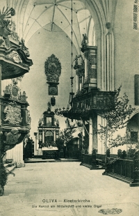 Miejsce pochówku książąt pomorskich, mnichów, opatów i przedstawicieli szlachty pomorskiej, od 1971 roku biskupów gdańskich (krypta biskupów pod kaplicą Opacką). Pod prezbiterium znajduje się krypta (4,5 × 12 m), a w posadzce kościoła płyty nagrobne, w okresie 1970–1971 część z nich umieszczono na ścianie nawy południowej. Tablicowe epitafia Reinholda Heidensteina i opatów: Ditharda, Kaspra Geschkaua (koniec XVI wieku), Dawida Konarskiego (początek XVII wieku). Pomnikowe epitafium szambelana Georga Konstantina Hülsena (1760, dzieło Johanna Heinricha Meissnera).