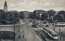 Lata 1936-1939 , Plac Jana Pawła II w drugiej połowie lat 30. XX w. - widok w stronę centrum. Po prawej za fontanną Bismarcka widoczna niezachowana kamienica nr 7 , w której mieściła się cukiernia Hundeck & Appelt. Na skwerku w lewym dolnym rogu, obok kamienia pamiątkowego, częściowo widoczny dąb Hitlera (Adolf-Hitler-Eiche).Skomentuj zdjęcie