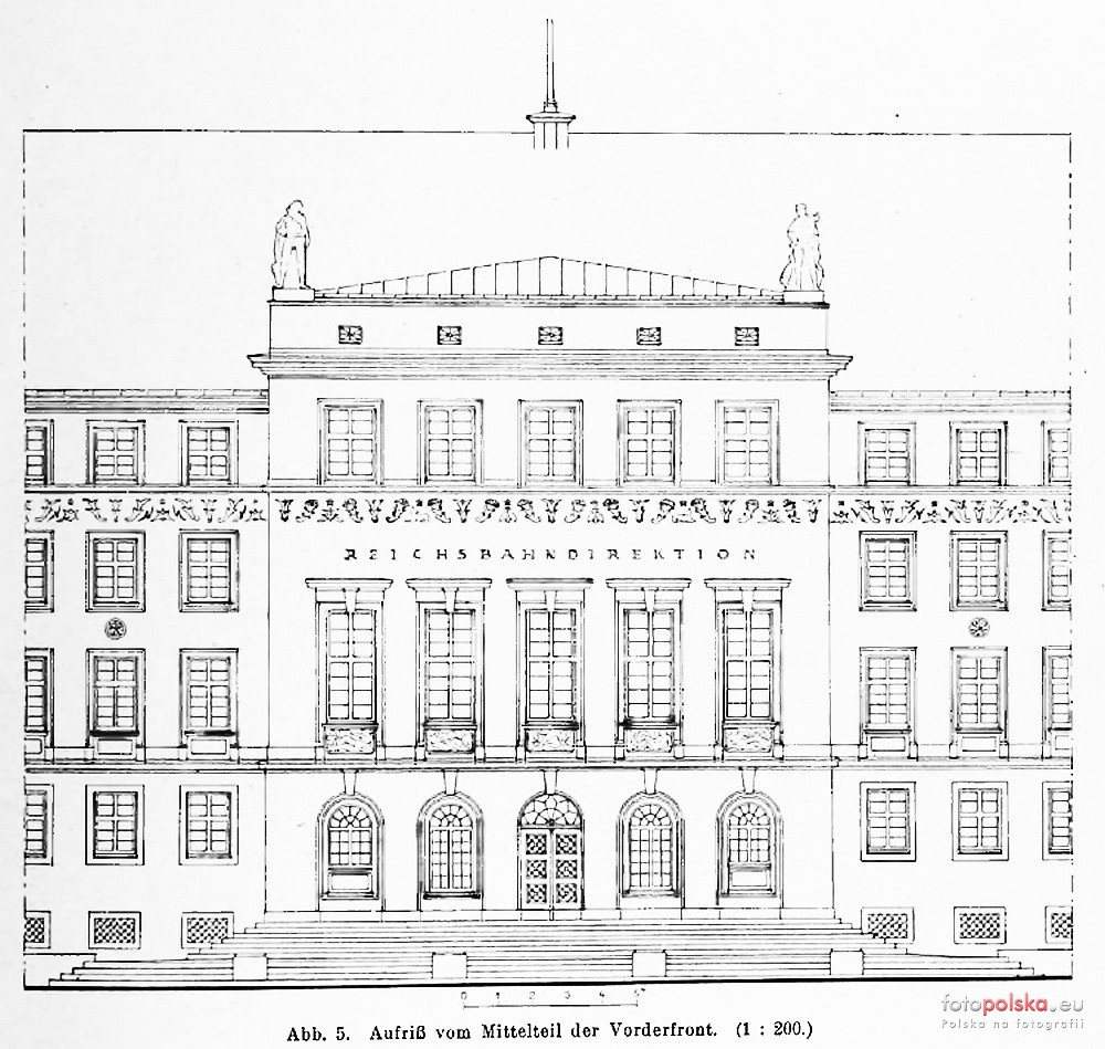 1925 , Środkowa część południowej fasady gmachu dawnej Dyrekcji Okręgowej Kolei Państwowych. Źródło: Deutsche Bauzeitung 1926, Nr 83. Takie samo ujęcie jak: , dodałem ze względu na nieco lepszą jakość.Skomentuj zdjęcie |