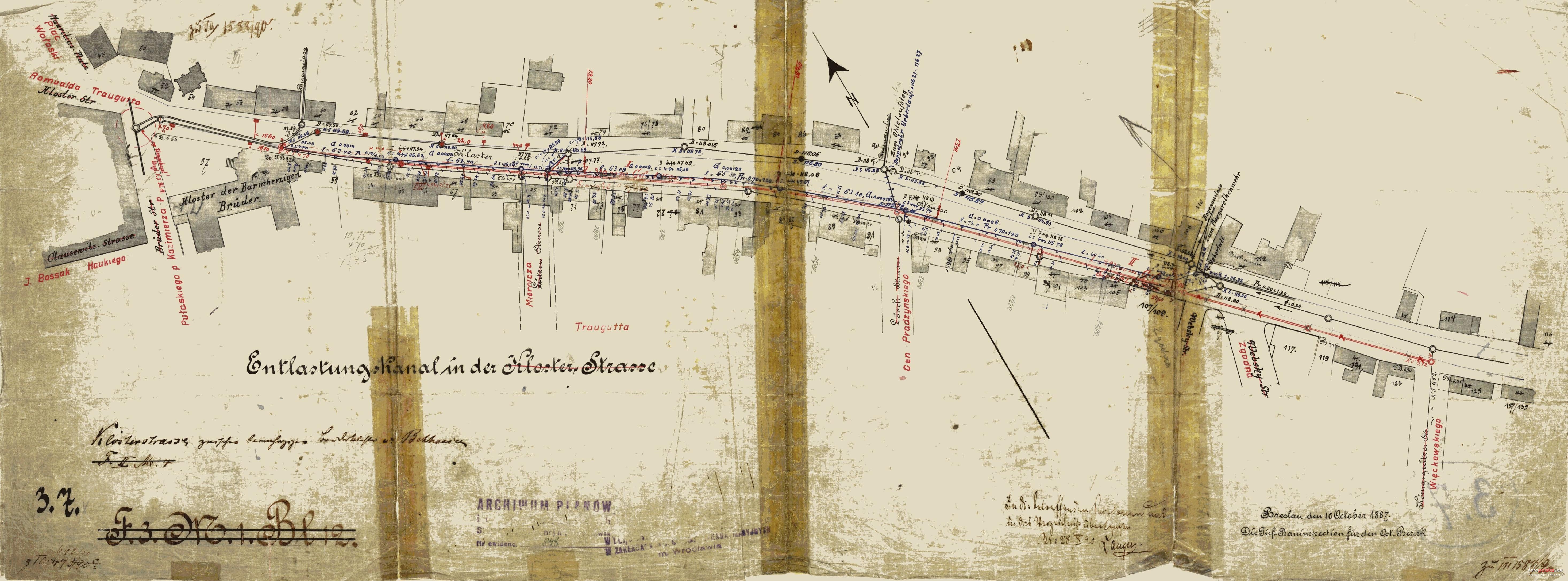 Lata 1887-1890 , Plan sieci kanalizacyjnej ul. Traugutta na odcinku pomiędzy skrzyżowaniami z ul. Pułaskiego a ul. Więckowskiego. Plan z 1887 r. z poprawkami naniesionymi w 1890 r..Skomentuj zdjęcie |