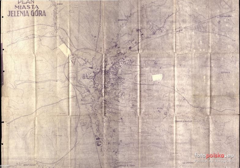 1949 , Plan Jeleniej Góry- opracowany wg.wcześniejszego, niemieckiego planu sprzed 1939 r.Pierwsze nazwy miejscowości- polskie (1945r), przed urzędową zmianą w 1951 r. np.Gostyczyn - Goduszyn, Czarny Strumień- Czarne.Skomentuj zdjęcie